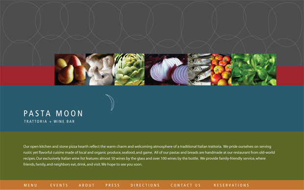 Website for Pasta Moon (this concept was not chosen). See business cards and menus